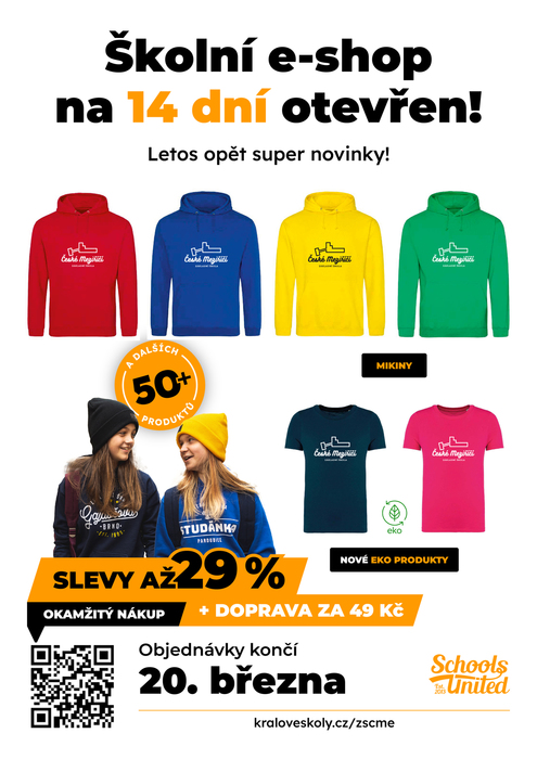 Nechali jsme si jako škola vytvořit vlastní volnočasovou školní kolekci oblečení, jejíž náhled vidíte níže a kterou je možné si aktuálně pořídit na našem e-shopu.